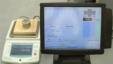 An electronic data collection form and a weigh-in of a moisture sample. Data from here goes directly to gINT®, BoreDM®, OpenGround®, RSLog® or Excel®. No Pencils — No Typing.